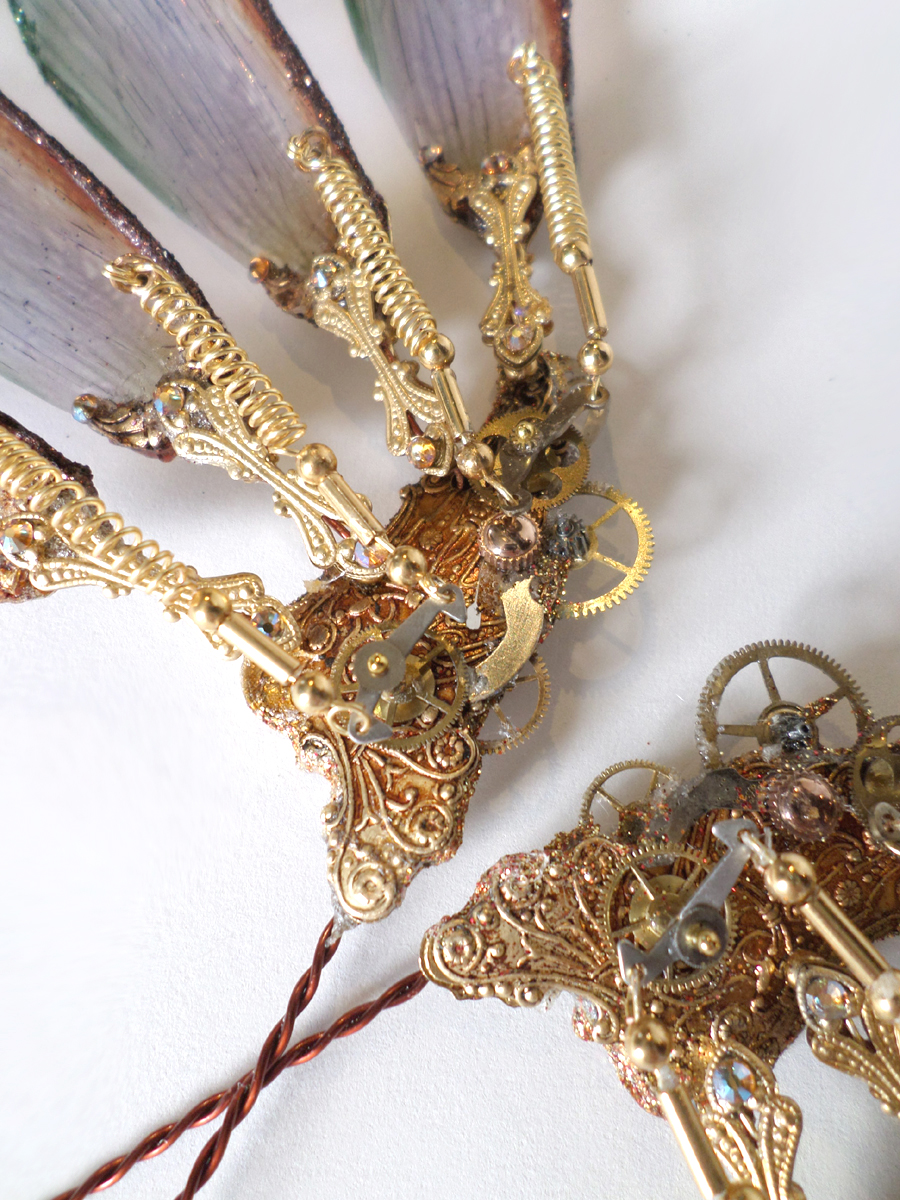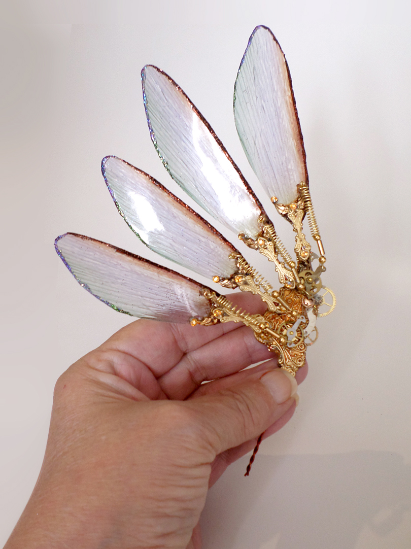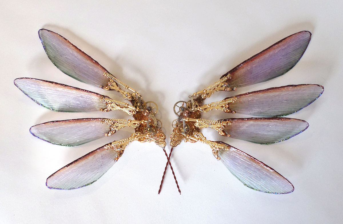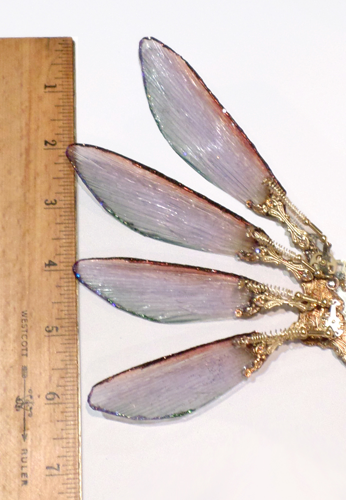 | These OOAK Steampunk wings are an exclusive design and made using transparency film with brass filigree and real watch gears and parts. Handmade springs give the look of working wings. Each wing section is movable so you can position the slant. The wing color goes from a warm brown to a lavender to a green. Complimenting glitters have been used to outline the edge in the colors that match the image. The transparency has been textured on one side to allow the colors to show through. Wings come with a pair of wire stems to insert into the back of the doll to get the right hole size prior to baking and to get the right position without damaging the doll or the wings with too much handling. These wires can be baked along with the doll and then removed after completely cooled. These wings would work well for dolls 7 - 10 inches tall. The wing stems are left long so you can cut them to the length you need. This is the only pair of this design. Click on the images to see a larger view. |